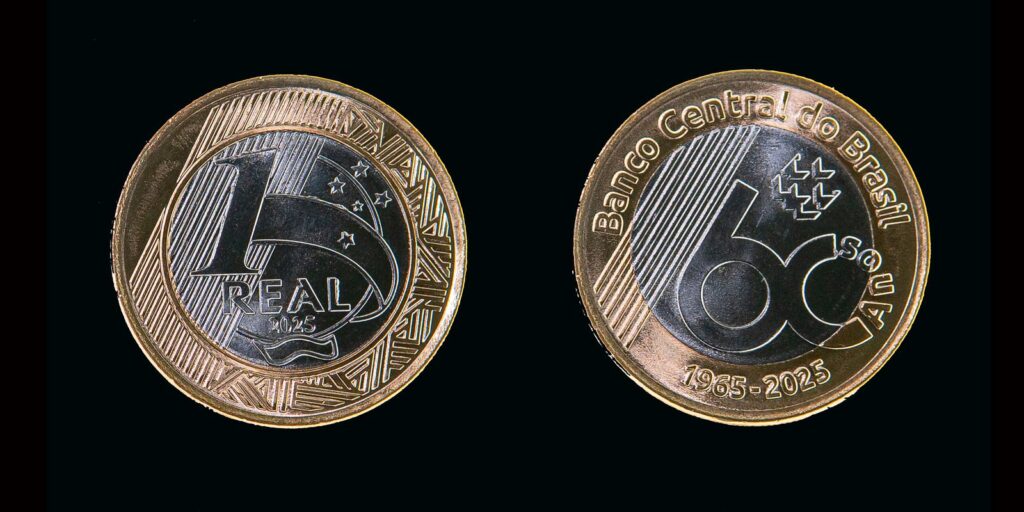 No anel dourado, aparecem as legendas “Banco Central do Brasil” e “1965–2025”. O reverso (parte de trás) seguirá o padrão da segunda família das moedas do tipo, em que aparece o valor de face de R$ 1.